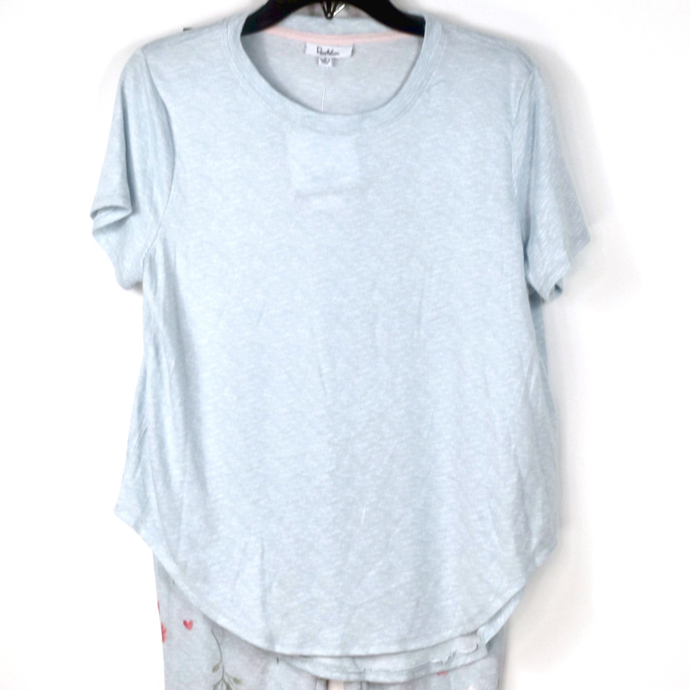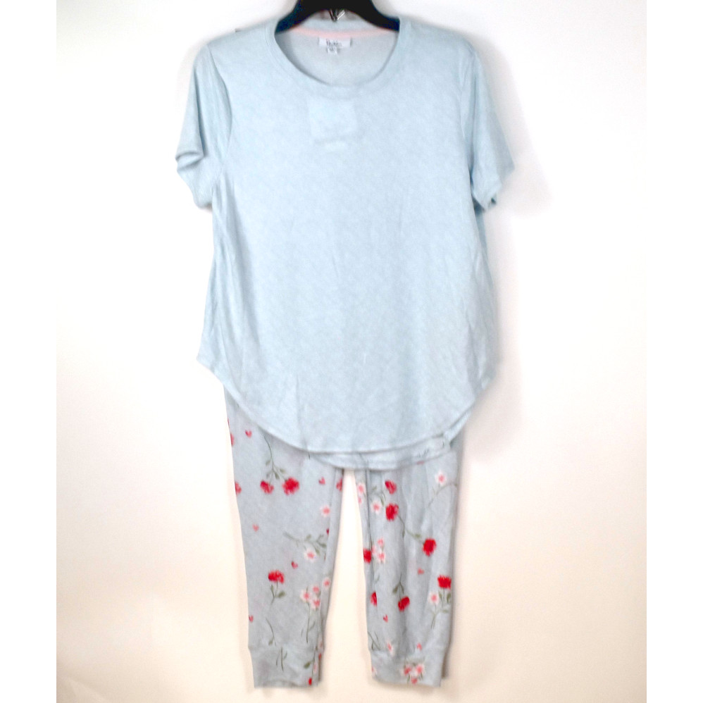 Roudelain Women's Whisper Luxe Top & Jogger Pants Pajama Set in Pearl Blue/High Rise, new with tags, no retail packaging. With this ultra soft pajama set, there will be little time for counting sheep. It has a rounded neckline and short sleeves in blue and jogger style pajama pants in heather blue with allover floral print. Retail $46.